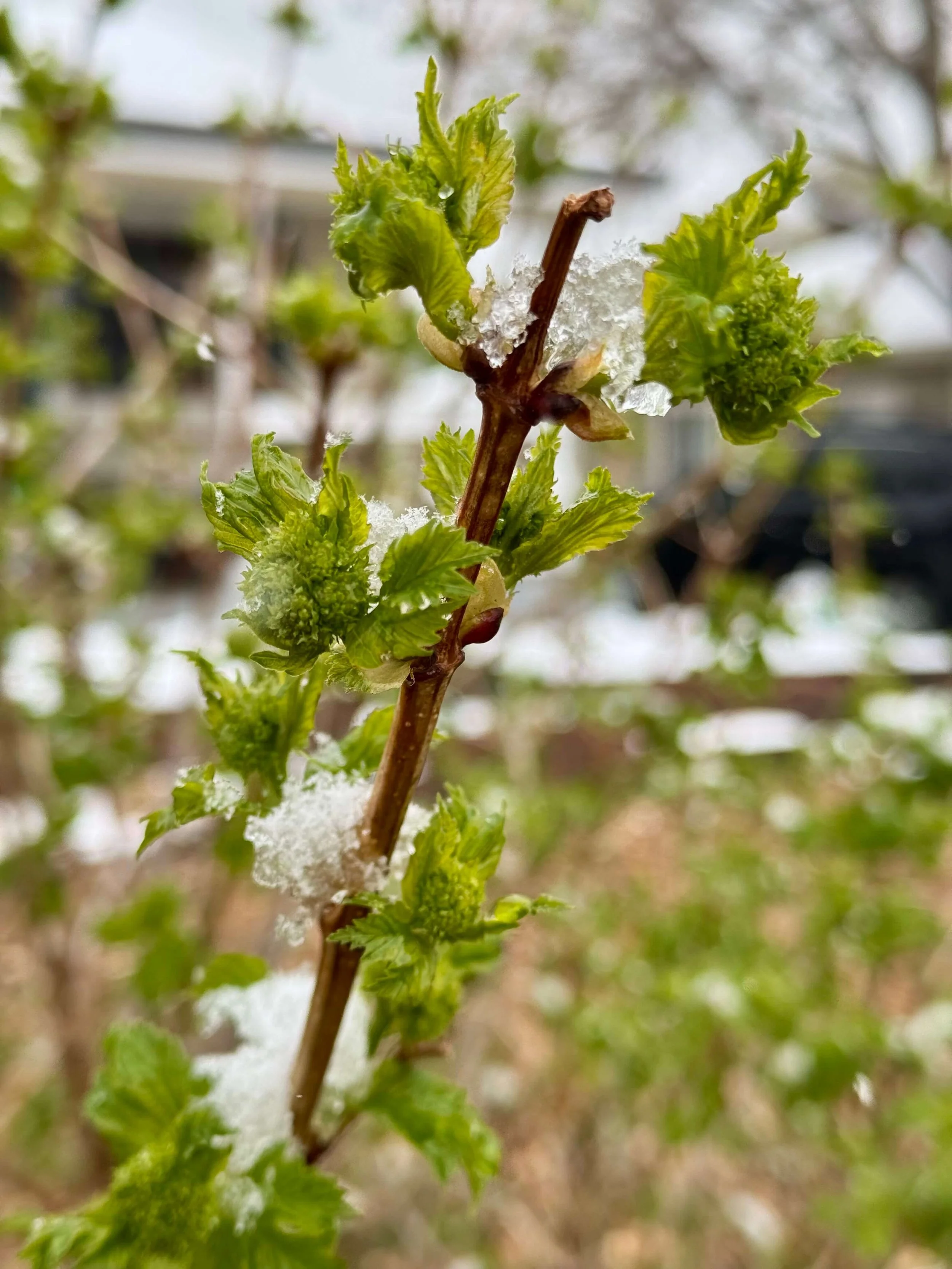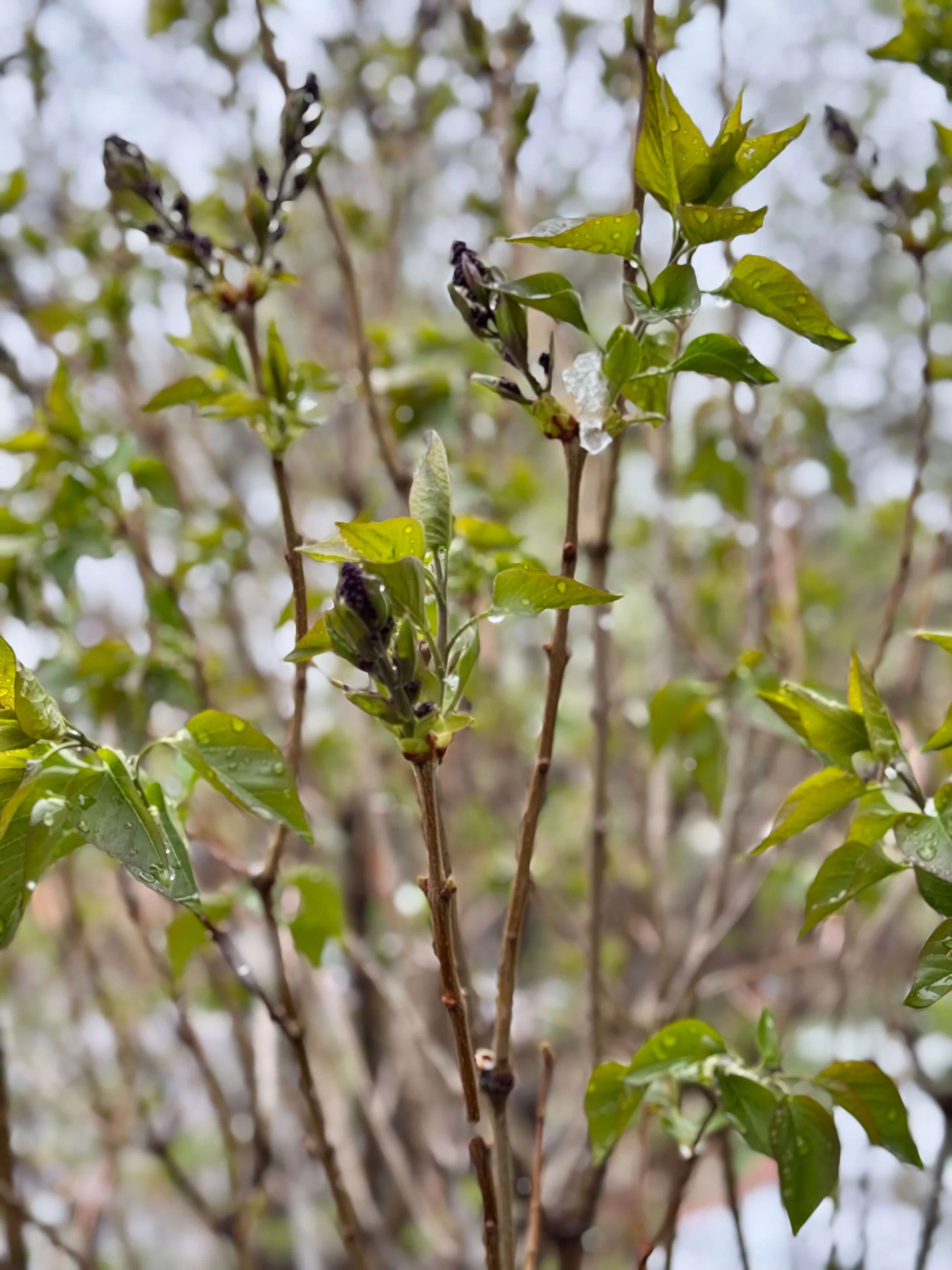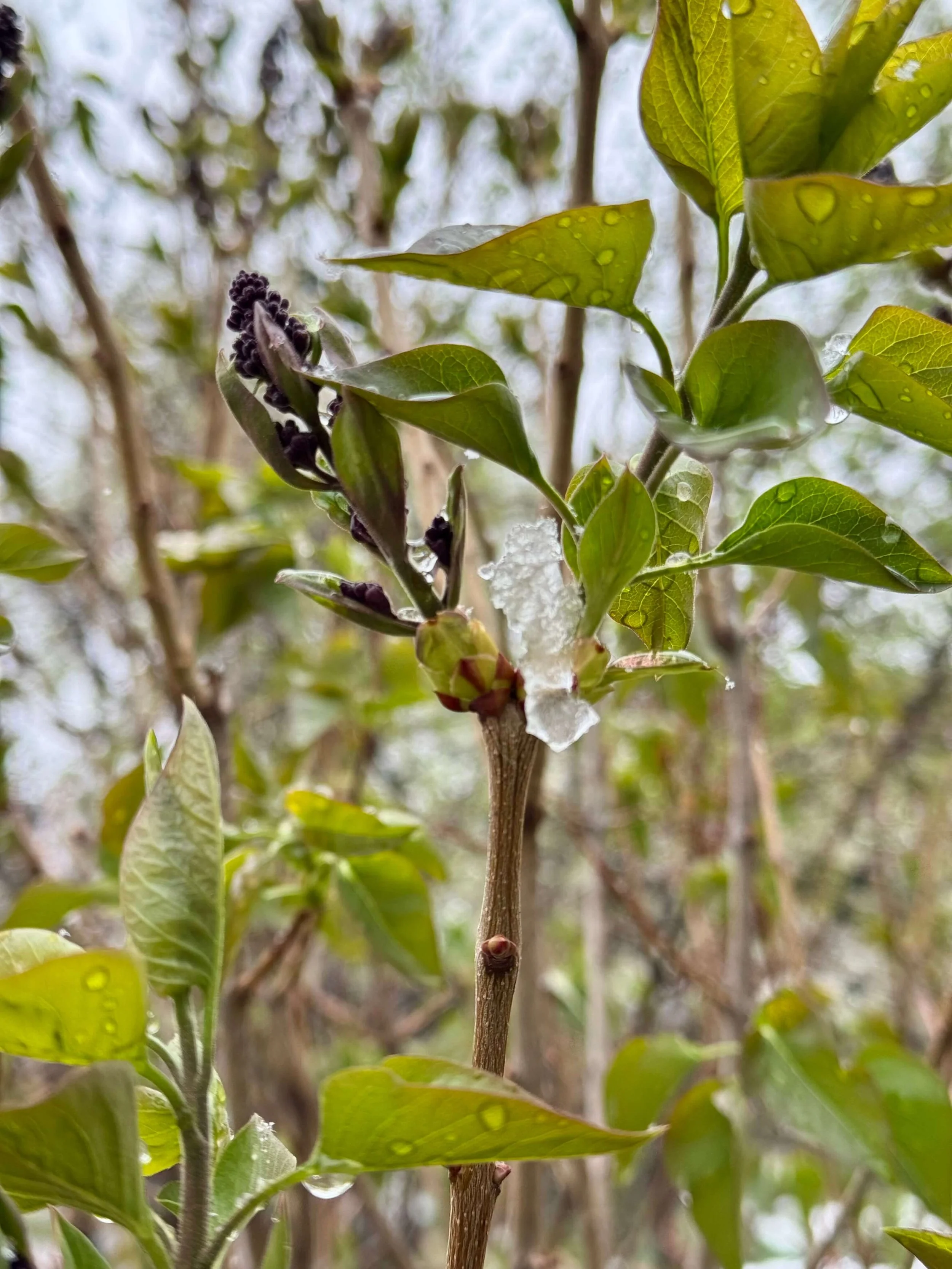 Lilac buds with ice on the branches during today’s April snow storm