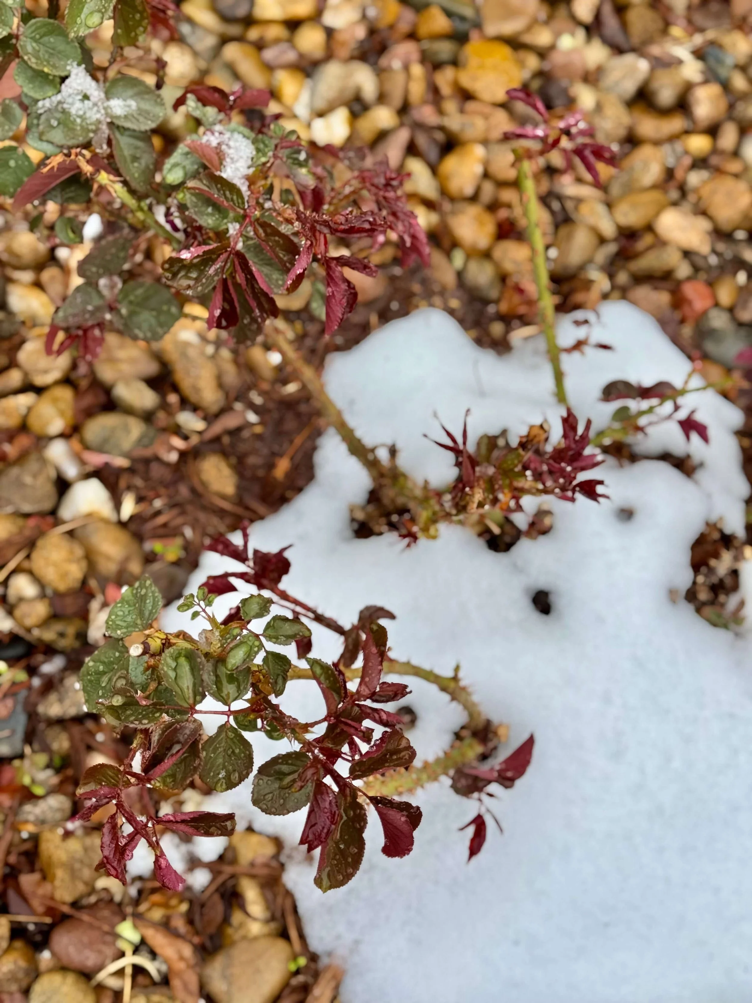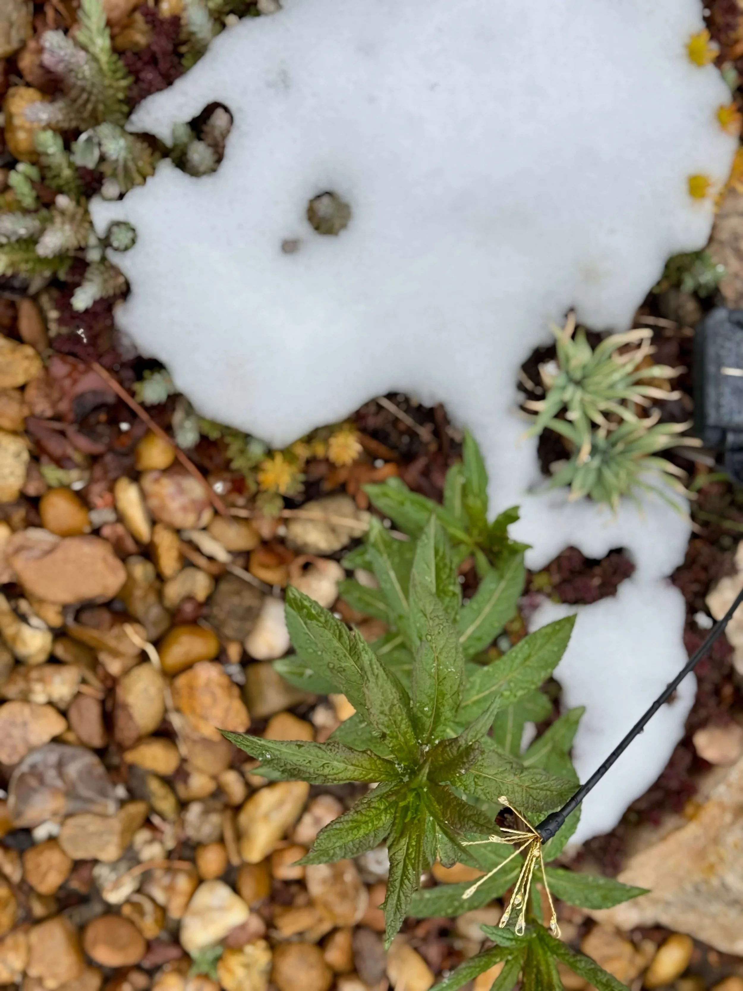 Dusted with today’s snow: sedum and culver’s root, hydrangea buds, roses, lilacs, penstemon, and my seven-month-old native Colorado garden with a young prairie fire crabapple