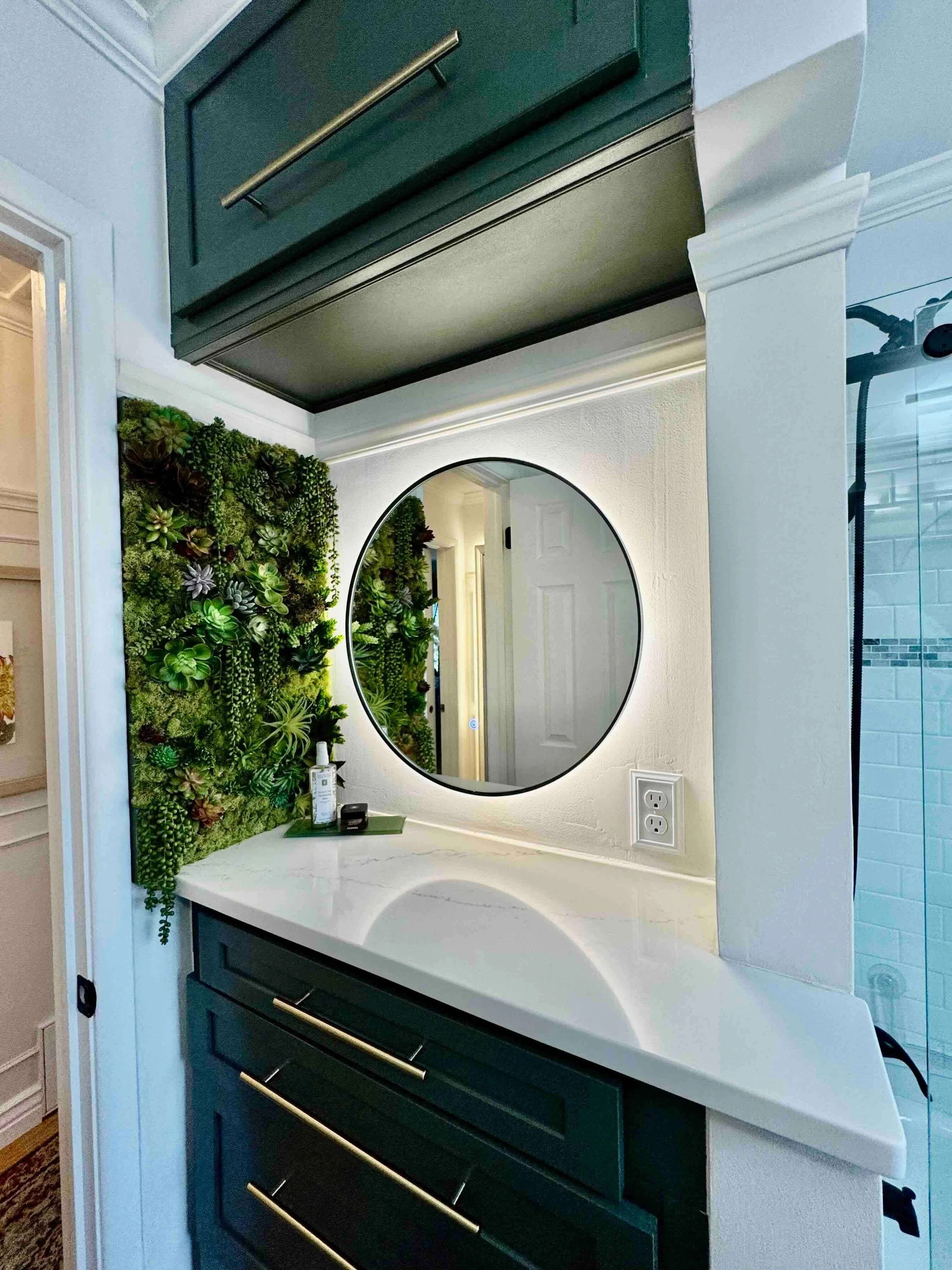We began with a simple 3D concept and refined the design as we selected the color palette and finishes, knowing this custom piece would become the visual anchor of the wall. Its deep green cabinetry and brushed hardware brought character and practicality to what was otherwise an overlooked corner.