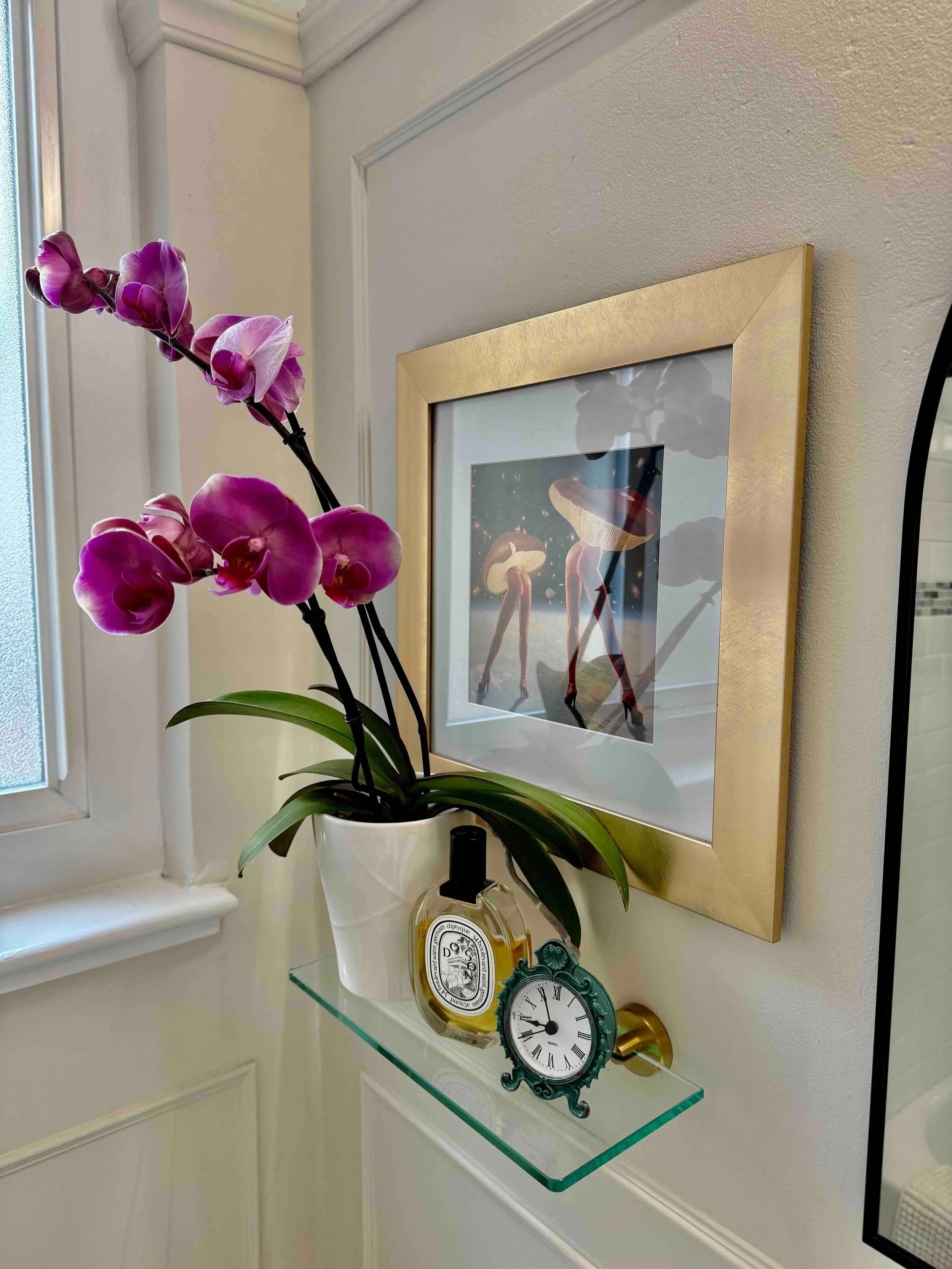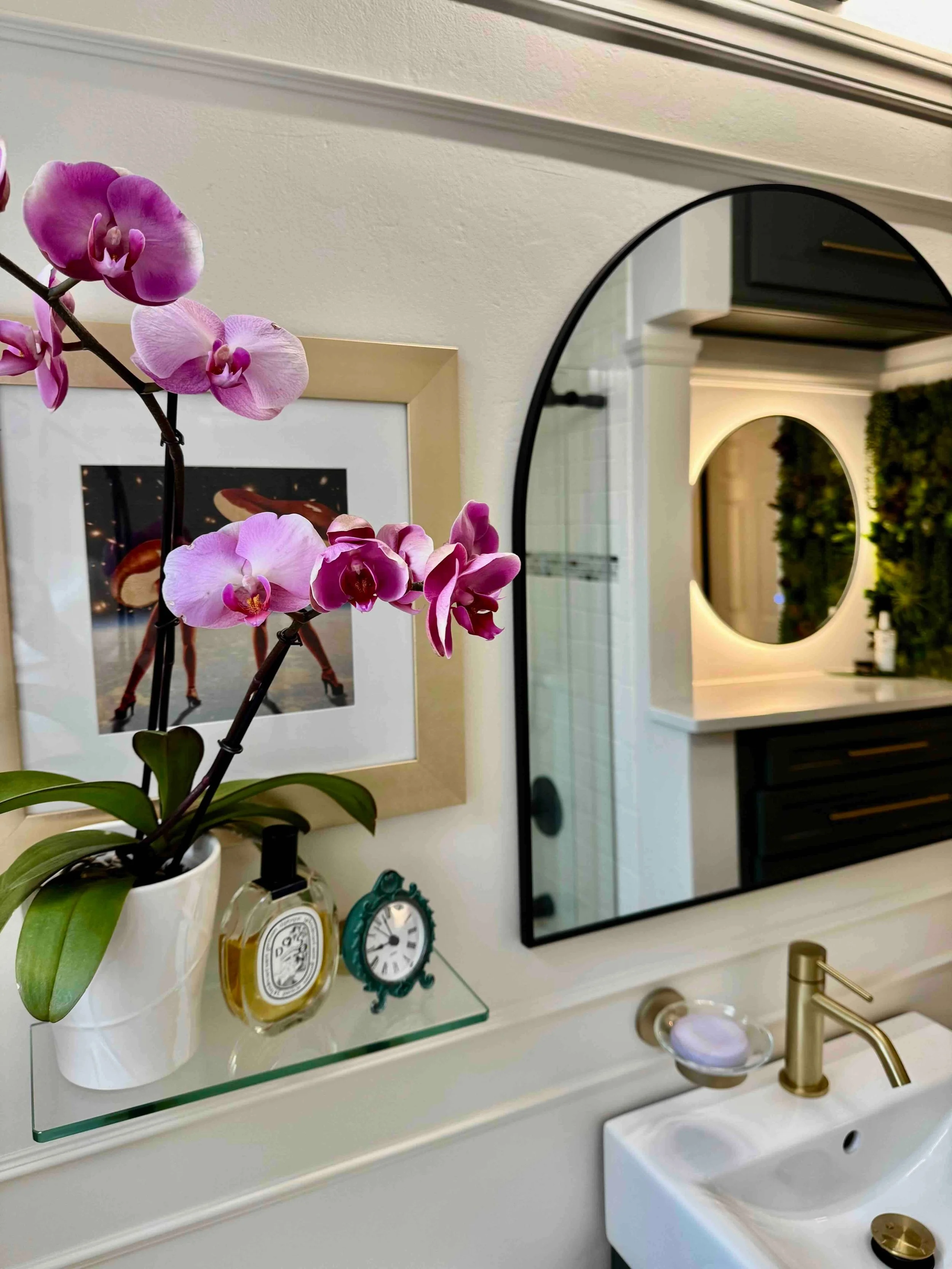 On the wall opposite the shower, every decision was driven by efficiency. Finding a sink base that fit the tight dimensions was tricky, so we refreshed the existing one with paint, a new faucet, and updated hardware. A wall-mounted soap dish and open shelves added style without sacrificing space, offering room for flowers, candles, and essentials.