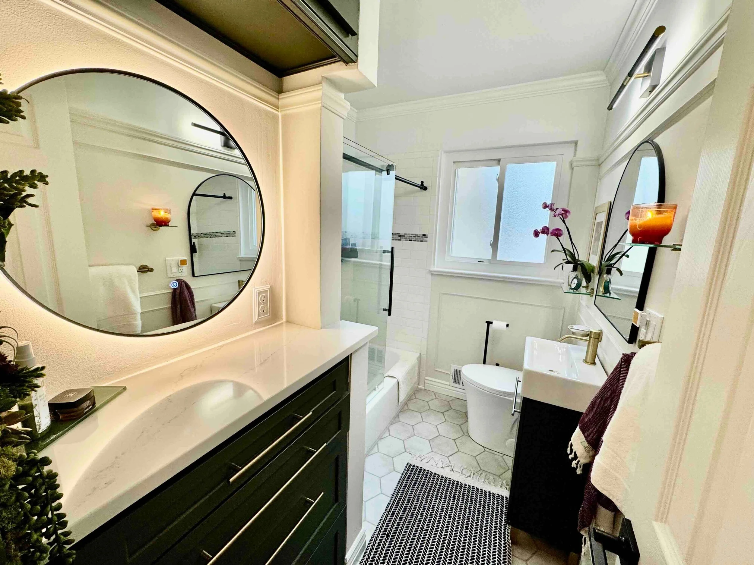 A soft, round backlit mirror introduces a contemporary glow, while geometric hexagon floor tiles maintain a crisp, fresh aesthetic. Crown molding and paneled walls infuse warmth and tradition, harmonizing with the space's clean lines.