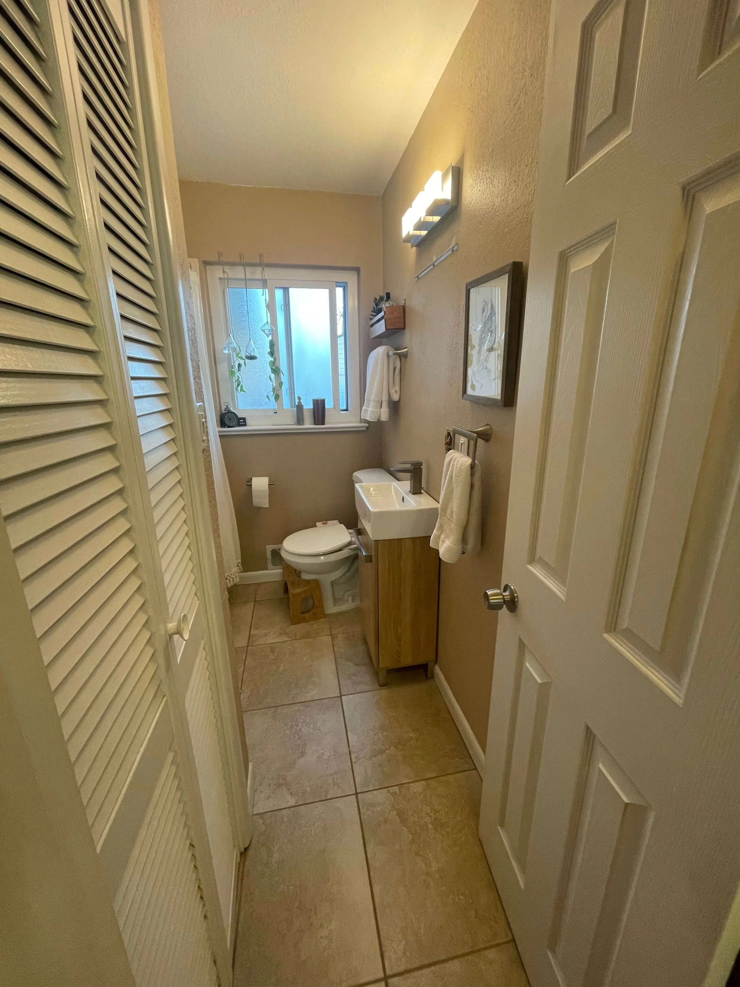 Guests were immediately met with slatted bifold doors concealing a storage closet—an awkward feature that blocked the bathroom door if left open.